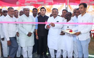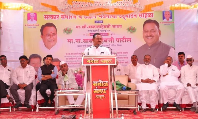 चाकूर येथील औद्योगिक वसाहत सहकारी संस्थेच्यावतीने चाकूर अहमदपूर तालुक्याचे आमदार बाबासाहेब पाटील यांची राज्याचे सहकार मंत्री व गोंदिया जिल्याचे पालकमंत्री म्हणून निवड झाल्यामुळे ना. पाटील यांचा सत्कार व उद्योग भवनाचा उदघाट्न सोहळा आयोजित करण्यात आला होता. त्यावेळी ना. पाटील बोलत होते. कार्यक्रमाच्या अध्यक्षस्थानी माजीमंत्री बाळासाहेब जाधव होते. तर प्रमुख पाहुणे म्हणून नगरपंचायतचे नगराध्यक्ष कपिल माकणे, पंचायत समितीचे माजी सभापती करीमसाहेब गुळवे, सोसायटीचे चेअरमन गोविंदराव माकणे, माजी सरपंच किशनराव रेड्डी,माजी उपसरपंच मुर्तूजा सय्यद, माजी नगराध्यक्ष मिलिंद महालिंगे, सहायक निबंधक आदिनाथ पालवे,नगरसेवक मुज्जमील सय्यद, माजी नगरसेवक इलियास सय्यद, राम कसबे, महंमद सय्यद आदी मान्यवर मंचावर उपस्थित होते.